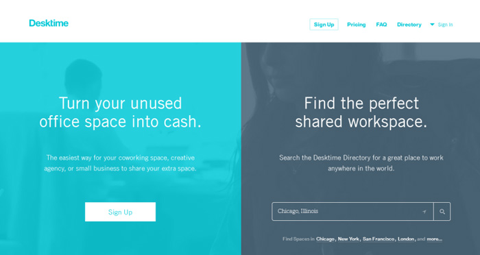 我们来看 Desktime 首页的网页布局,他们将页面分为左右两部分,左侧用于满足有空闲办公室要出租的用户,右侧满足还没有自己的办公室,要寻租的用户。这将网站上两个同样重要的功能有效地展示了出来。