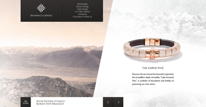 Shamballa Jewels 是一家经营珠宝首饰的公司,该网站用一个独特页面来展示他们的产品,这个页面没有滚动条,且完全充满整个屏幕。