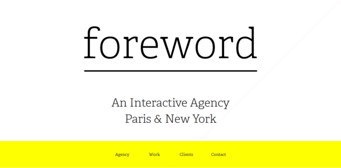 从 FOREWORD 的主页上可以清晰地看到,他们将总部设在巴黎和纽约,页面上没有任何图形图像设计,只通过开放式的字体和颜色的设计来告诉用户他们该关注什么。