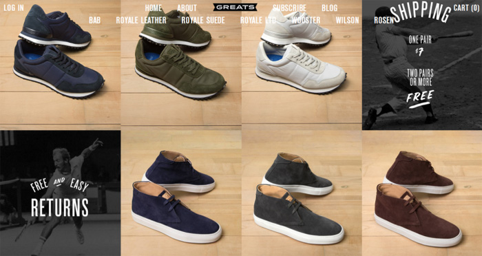 GREATS 是一家位于纽约的男鞋销售企业,他们的产品销售主要通过网站。GREATS 的网站选择了网格布局方式,在主页堆叠模块,每个模块显示一双鞋子的图像。